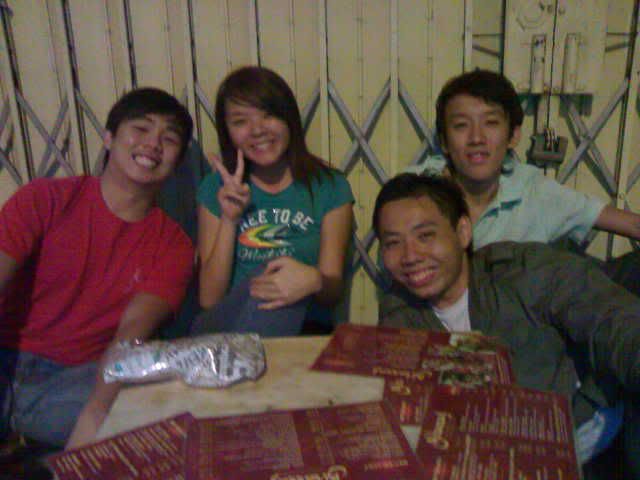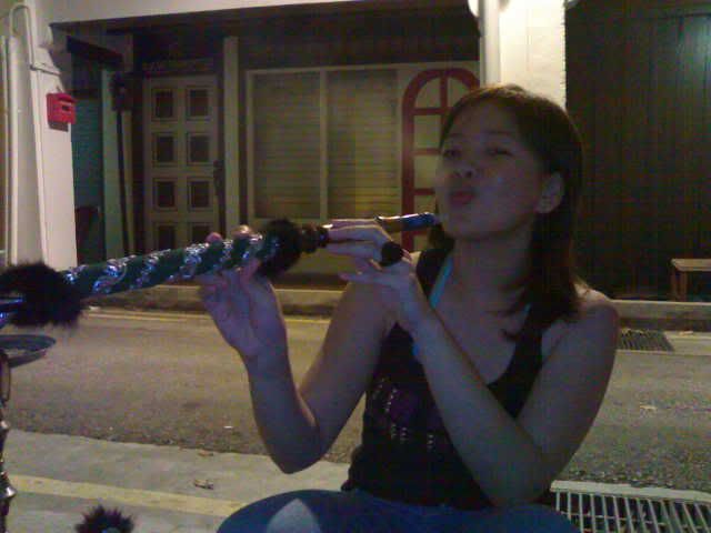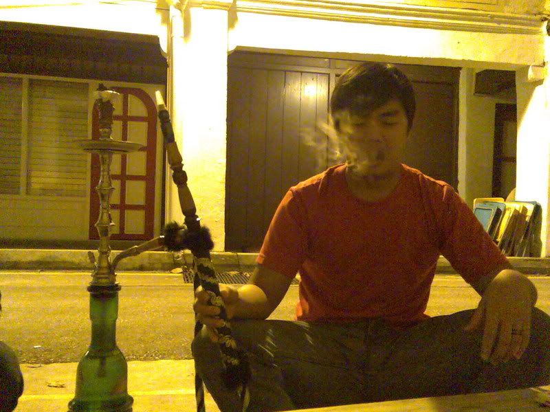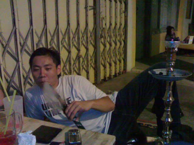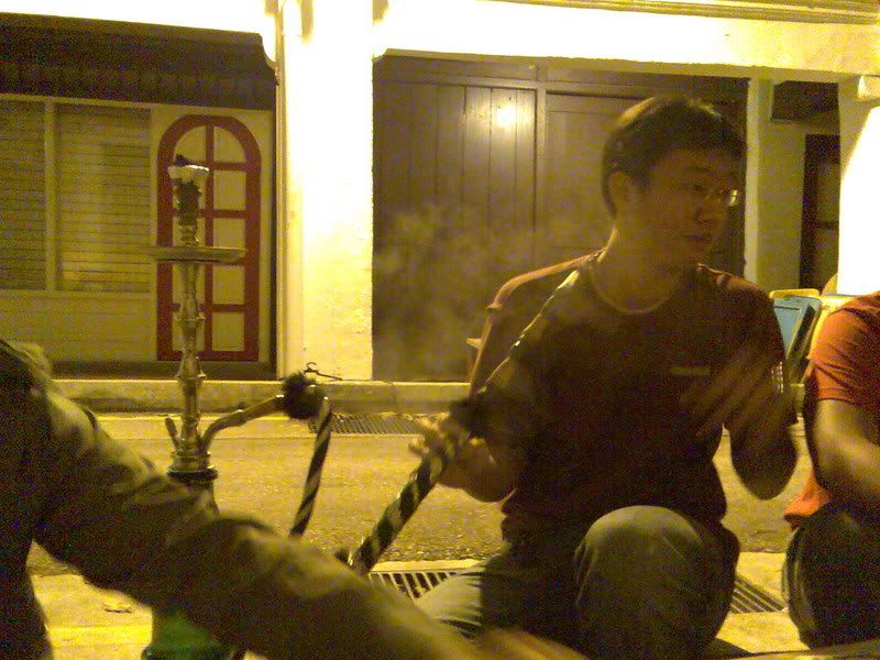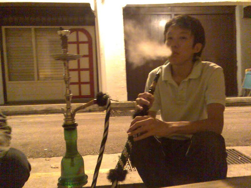 Me and the boys (from left: jh, me, top:kai yuan, bottom: chris) Me trying it out! The apple flavor was not very strong. Michelle taking a puff Kai yuan the ex smoker. Jh the ex smoker number 2. Roonie the non-smoker(as we can tell haha) And finally Chris, the non-smoker who looks every bit like a compulsive smoker haha. He was totally enjoying himself, in that position and all. Looks abit like opium smoker though, no? haha.. After that we headed to marina south ktv cum pubbing. The night was still young. haha... played bridge while drinking and singing ktv. The place was quite nice and cozy.. great place to hang out with friends at night. Had a bacardi breezer and a glassful of foster's beer as punishment for losing bridge. -bleah- Oh ya, and there was a guy who could sing very well. He kept challenging the si4 da4 tian1 wang2 with his canto songs.. not bad, his voice is good enuf to compete with them i think heh..   After the pubbing session (after which Chris totally concussed cos of sleepiness) we headed to the railway station for supper. I din even noe of this place till Roonie suggested it. The food was very yummy! Buy by then me and michelle were very full (from the free flow of nuts at the ktv place) so we just kop-ed the boys' bee hoon goreng and mee soto. Meanwhile, Chris was dozing off in Jh's car hahaha.. poor him. Must be really tired.   And that rounded up our outing for tt night. Must go for another outing soon k guys!    In Chris' words, shisha - $10++, foster's beer - $20++, peanuts -- free flow, mee soto -- $2.50, Great night out - Priceless.